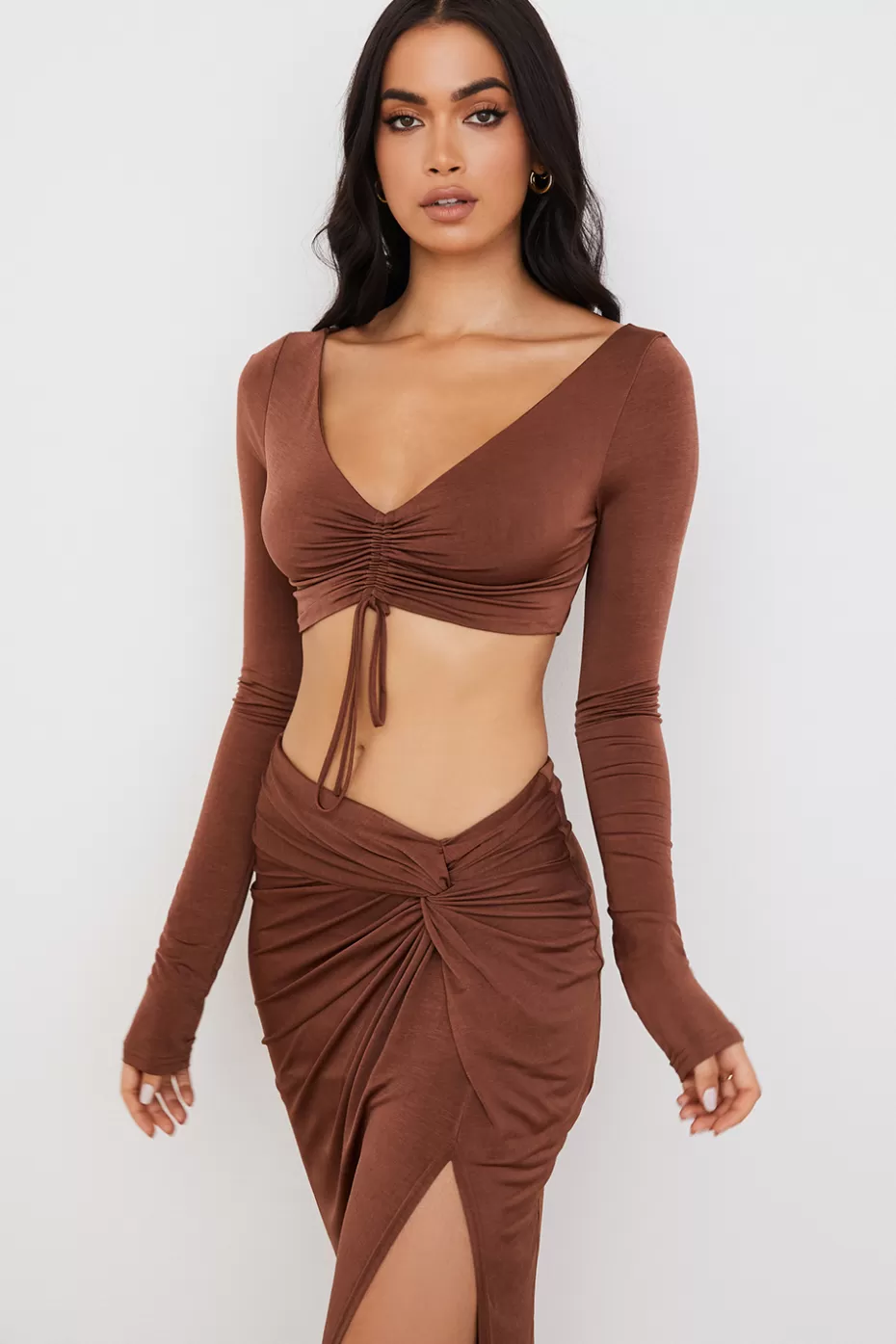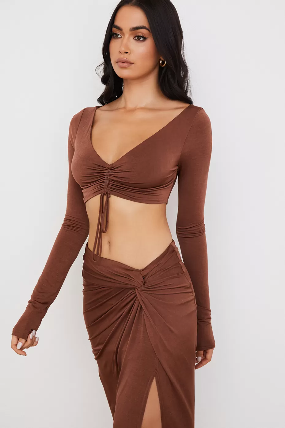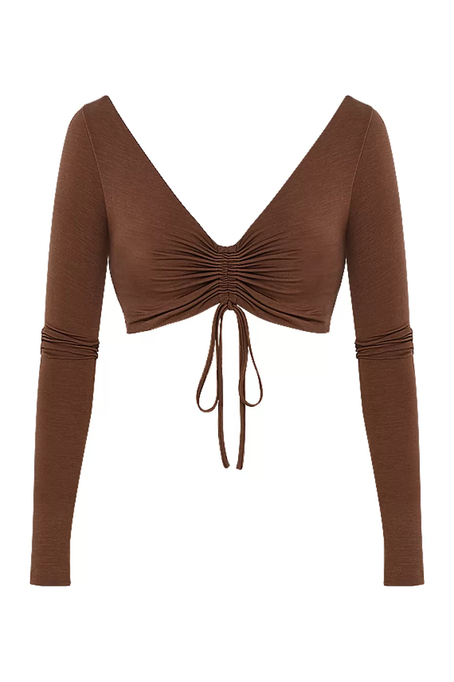 'Angelita' is super cute, it's cut from our soft stretch jersey that is so comfy to wear. It features a sexy plunge neckline with adjustable drawstring ties to the front to accentuate the pretty gathering and the long slim fitting sleeves means it can be worn in any weather.