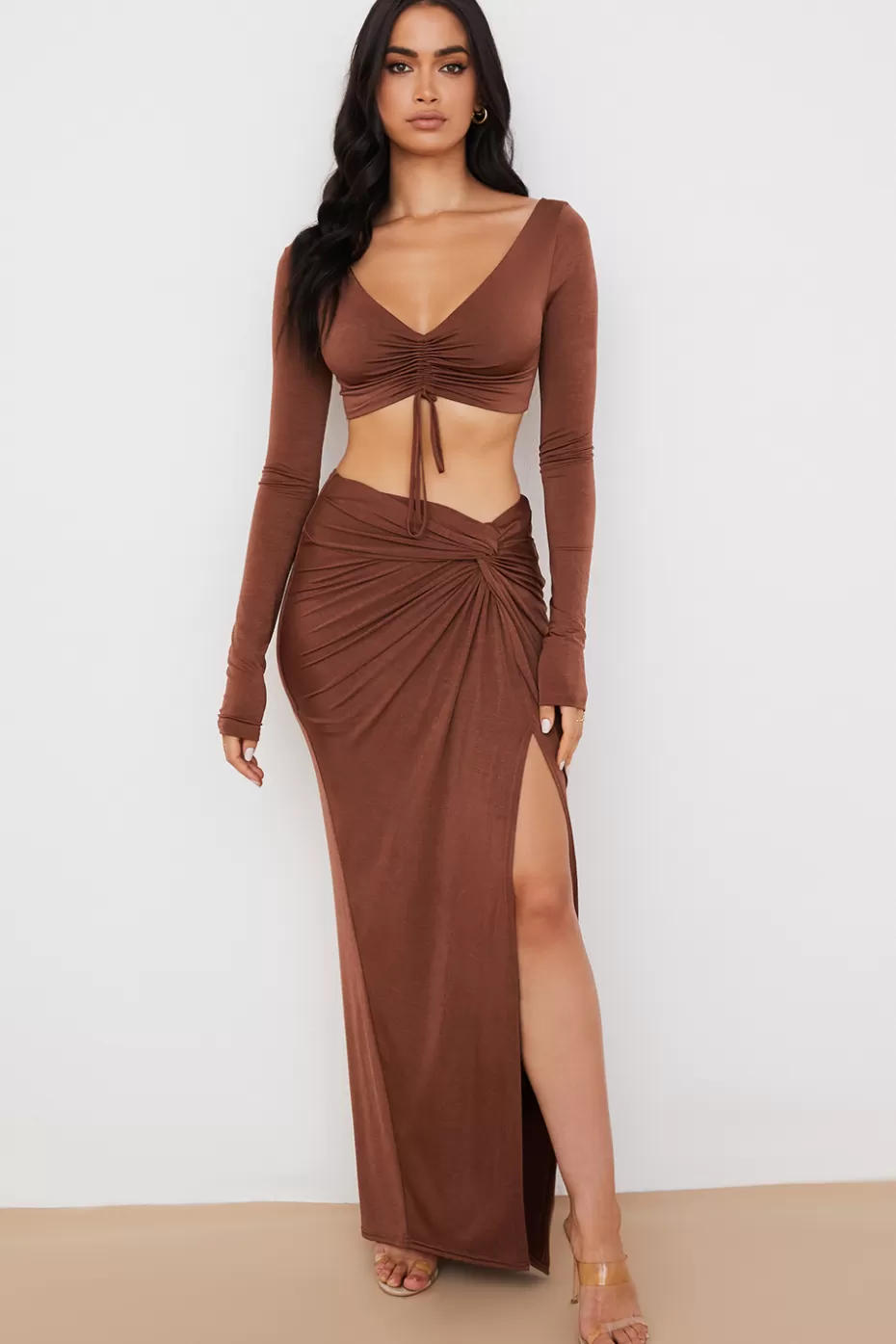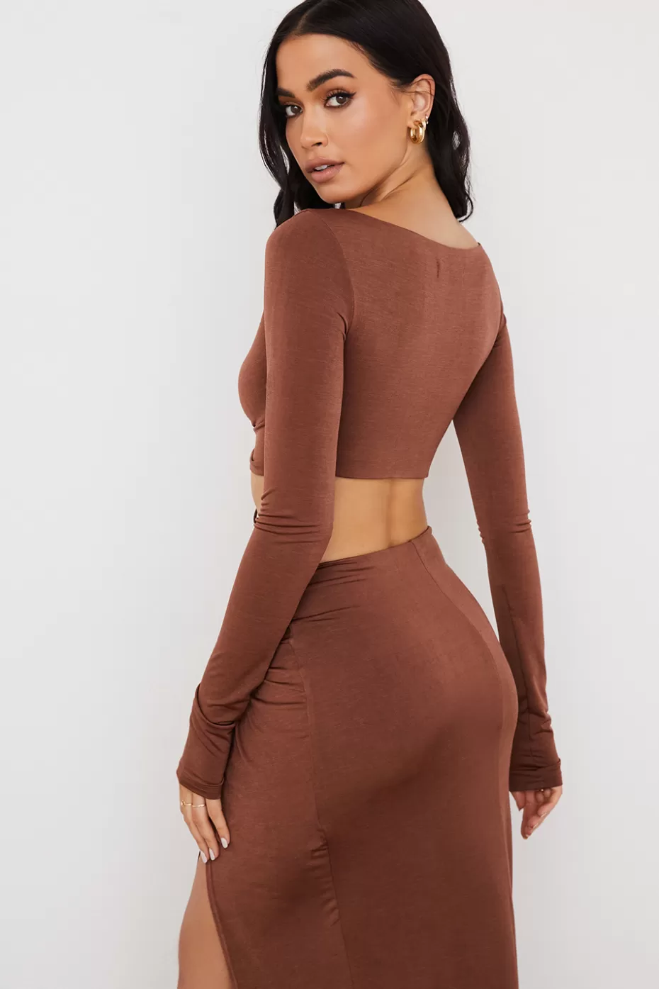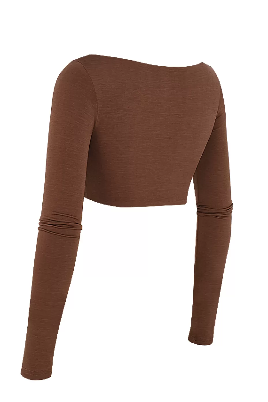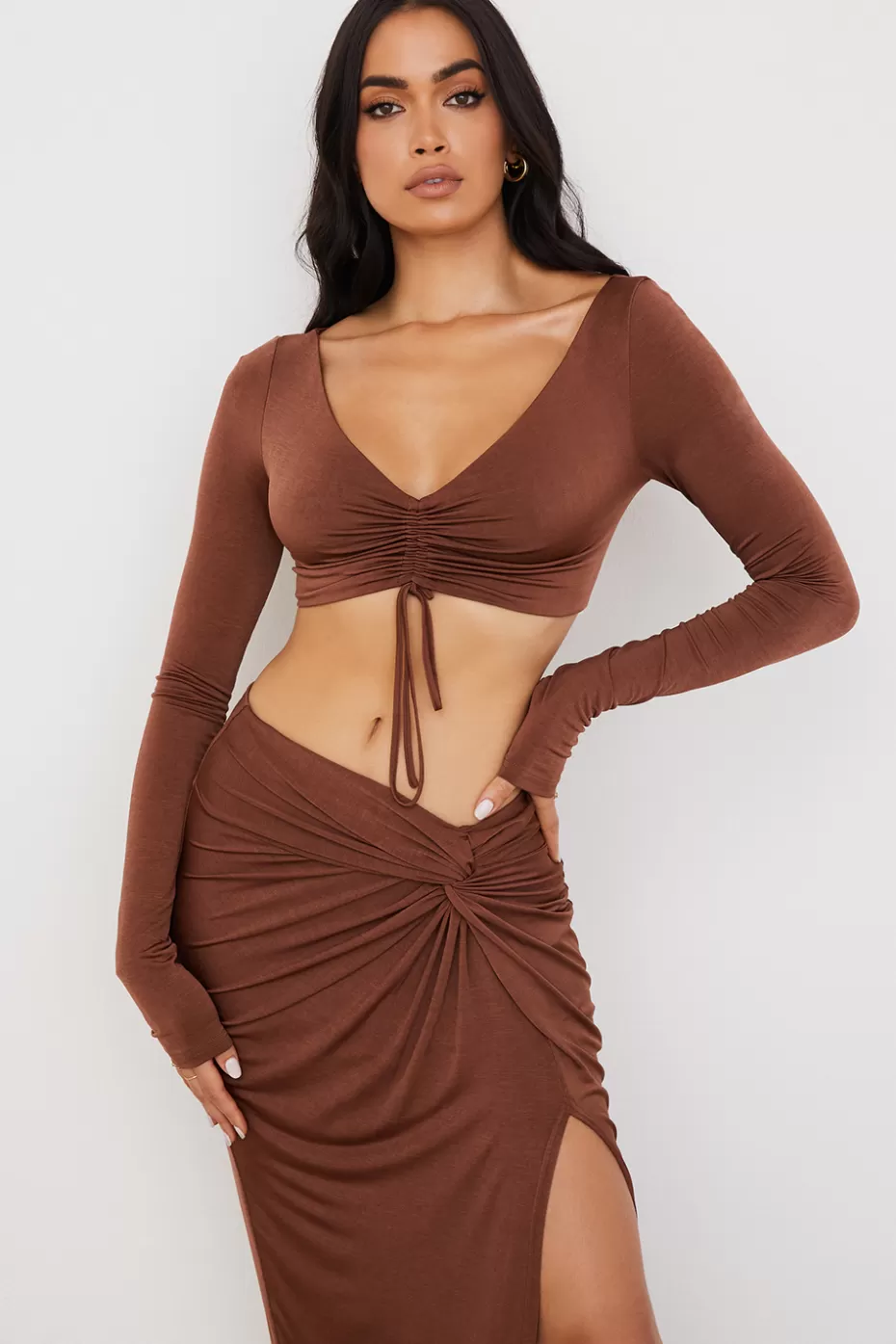 'Angelita' is super cute, it's cut from our soft stretch jersey that is so comfy to wear. It features a sexy plunge neckline with adjustable drawstring ties to the front to accentuate the pretty gathering and the long slim fitting sleeves means it can be worn in any weather.